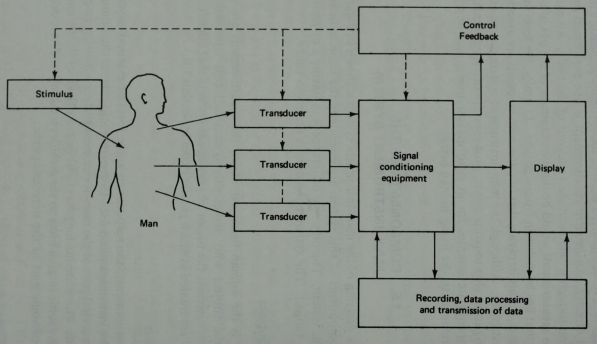 A biomedical system consists of several interrelated components that work together to measure and interpret physiological signals. Biomedical systems typically include a stimulus (if required), transducers to convert physiological variables into electrical signals, signal conditioning units for amplification and filtering, display devices for visualization, and recording or data-processing units for storage and analysis. In some cases, feedback or control mechanisms are also incorporated for automatic regulation of medical devices or therapies.