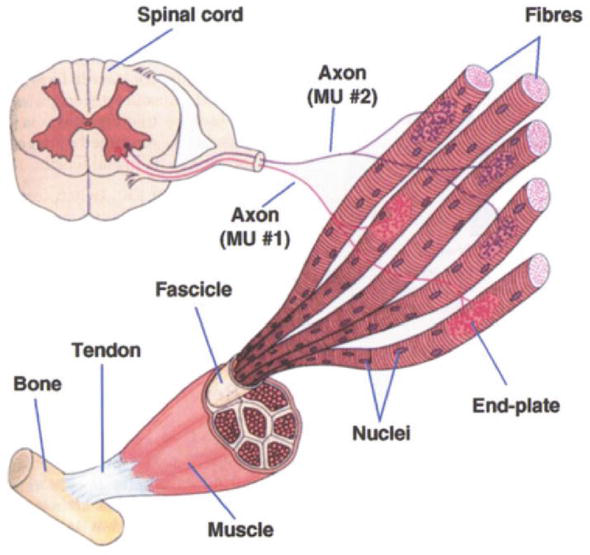 A motor unit consists of an α-motor neuron located in the spinal cord and the group of skeletal muscle fibers it innervates. The α-motor neuron extends its axon from the spinal cord to the muscle fiber, forming synaptic connections known as motor end plates, as shown in Figure 2.